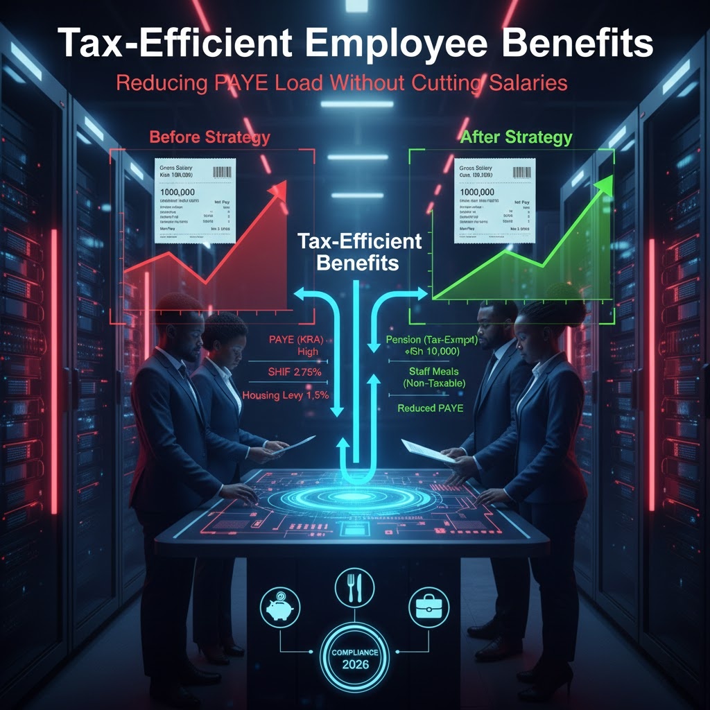 Tax-efficient employee benefits allow businesses to lower PAYE liability, improve cash flow, and retain talent without cutting salaries. Strategic planning ensures compliance with KRA, eTIMS, and Finance Act regulations, while maximizing employee satisfaction.